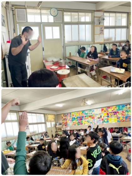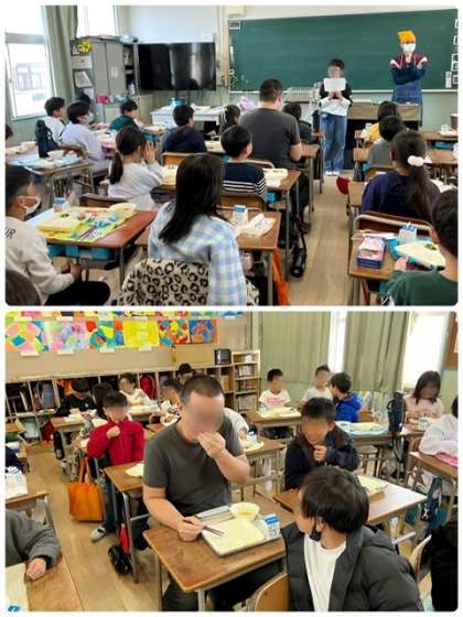 3年生の教室では、とても楽しそうに調理員さんと給食を食べる子どもたちの姿がありました。質問にもたくさん答えてくださり、みんなとても喜んでいました。