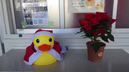 12月6日(水)校長室のあひる隊長がサンタさんになっています。ポインセチアもきれいです。