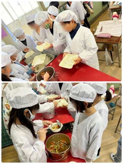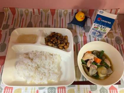 「じゃこ豆」は、ゆでたちりめんじゃことでんぷんをまぶして揚げた大豆を甘辛く味付けした、児童にも人気のある献立です。
