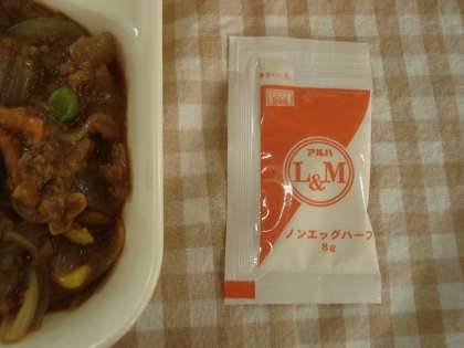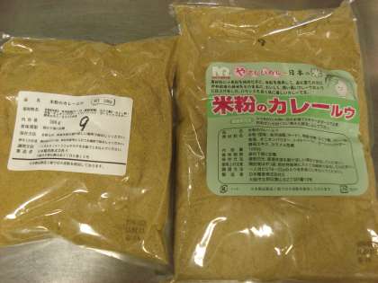 今日のドライカレーには、小麦粉の代わりに、米粉で作ったカレールウを使っています。また、グリーンサラダには卵の入っていないノンエッグドレッシングが添えられています。