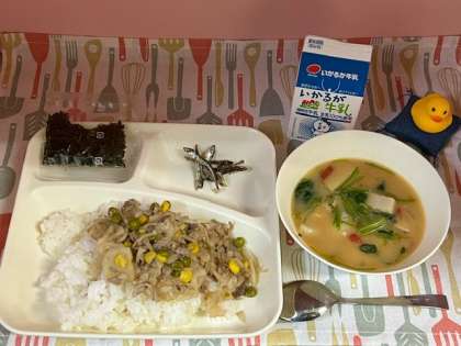 「れんこんのちらしずし」は豚肉・れんこん・グリンピース・コーン・かんぴょうを具材に、粉末こんぶを加えることでうま味を出した混ぜごはんです。きざみのりをかけていただきました。