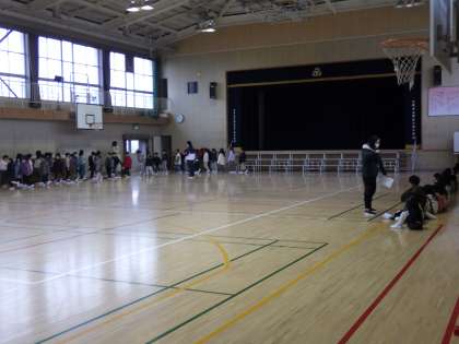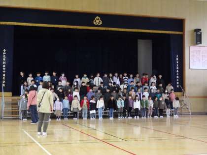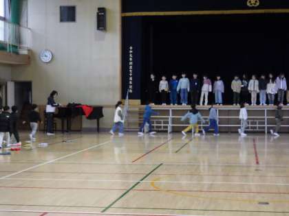2月5日(月)1年生は学習発表会に向けて体育館で練習しています。元気な声が体育館に響いています。
