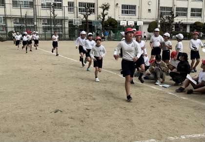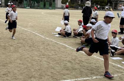 ペアで記録をとる児童も、一生懸命走る友だちに「ラスト1周、頑張れ」と声をかける姿も見られよい大会となりました。