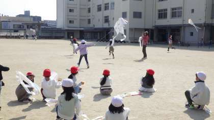 3月14日(木)1年生が凧あげをしています。風に乗って凧が大空に上がっています。