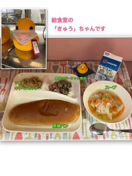 給食室に入ると、あひるの「きゅう」ちゃんがマスクと名札をつけて、1年生をお出迎えしてくれました^^