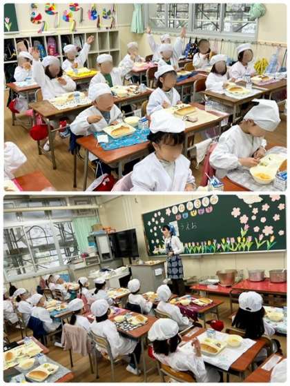 教室では担任の先生に給食でのルールを教えてもらい、お友だちと楽しく給食を食べていました。おかわりの手もたくさん挙がっていましたよ!!