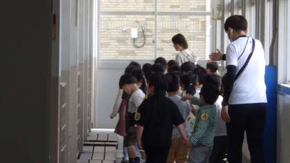 4月15日(月)1年生が校内を見て回っています。職員室や保健室、校長室などの学校施設の確認をしています。