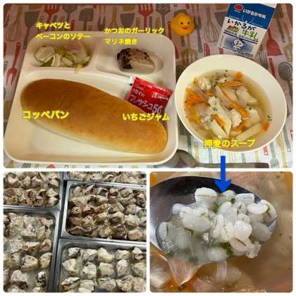 今日の「かつおのマリネ焼き」は卵を使用していないノンエッグドレッシングなどで下味をつけ、焼き物機でじっくり焼いています。
