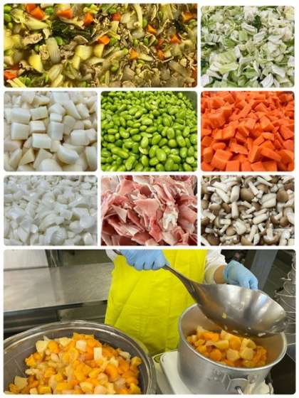「豚肉と野菜のカレースープ煮」は豚肉を主材にたくさんの野菜を使用した、スープ仕立ての献立でした。1年生にも好評で、多くの児童がおかわりをしていました。