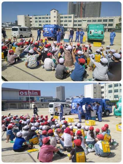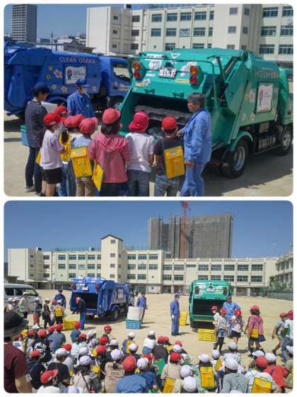 社会科の学習で、大阪市環境局の方に来ていただき、ごみについてのお話を聞いたり、パッカー車を動かしていただいたりしました。収集車が流している曲はごみの種類によって違うことを聞きました。子どもたちは一生懸命お話を聞いたり、目を輝かせてパッカー車を見ていました。