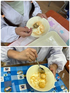 きなこを上からまぶして食べました。1年生の教室でも、残っていたおだんごはあっという間に売り切れていました。