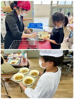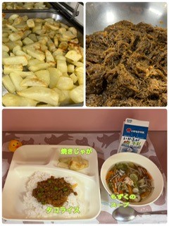牛・豚ひき肉とたまねぎをいため、カレー粉・ケチャップ・ウスターソースなどで味付けしています。子どもたちにも大人気でした^^