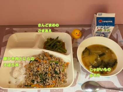 今日の給食のそぼろ丼は、にんにくとしょうがで香りと風味を増し、豚のひき肉・にんじん・たまねぎ、青みににらを使っています。
