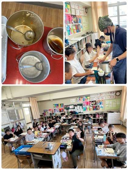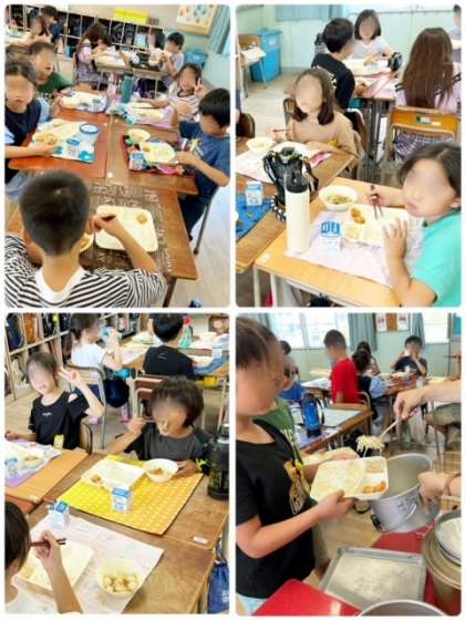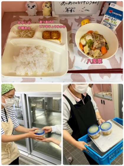 本来八宝とは八種類ではなく、たくさんの材料を集めて作ったという意味だそうですが、ある児童は「今日の八宝菜、ちゃんと八種類やで〜!!」と教えてくれました。確かに今日の給食では、豚肉・うずら卵・キャベツ・たまねぎ・にんじん・たけのこ・ピーマン・しいたけ(干し)を使用して作られていました。ちゃんと給食献立を見てくれているのですね^^
