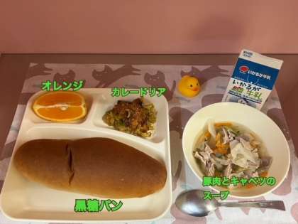 ドリアはライスグラタンともいい、ピラフにホワイトソースをかけて、オーブンで焼いた料理のことを言います。今日の給食では、米粉のカレールウの素やクリームなどを使って作った「カレードリア」が登場しました。