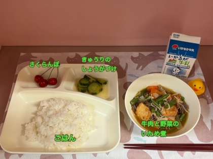「牛肉と野菜のいため煮」は牛肉を主材に、糸こんにゃく・あつあげ・たまねぎ・にんじん・えのきたけ、青みにさんどまめ(冷)を使用し、甘辛く味付けた献立です。ごはんに良く合うと好評でした♪