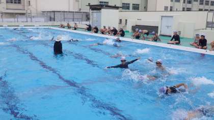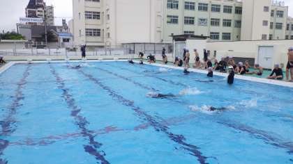 7月1日(月)朝から雨ですが水泳の授業のできる気温、水温です。5年生はクロールの練習です。頑張っています。