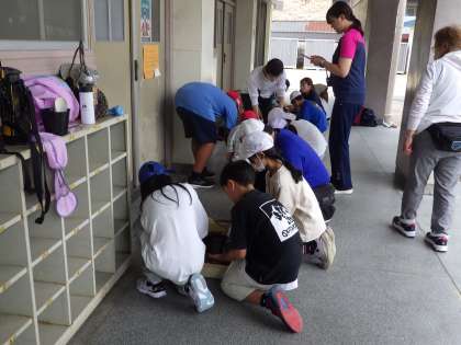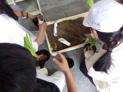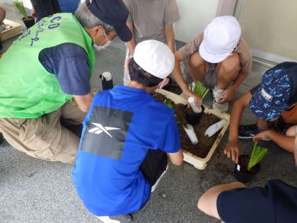 7月2日(火)鶴見公園事務所のみなさんと旭区役所のみなさんの指導の下、栽培委員会のみなさんが花しょうぶを植えています。