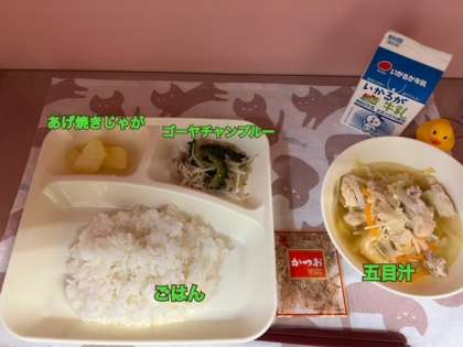 チャンプルーとは沖縄の方言で「ごちゃまぜ」という意味で、豆腐といろいろな食材を炒めた料理をさします。今日の給食では、ゴーヤと豚肉・もやしをいため、塩とこいくちしょうゆで味つけしています。別添のかつおぶしをかけることで、風味とうま味が増してさらにおいしくなりました。
