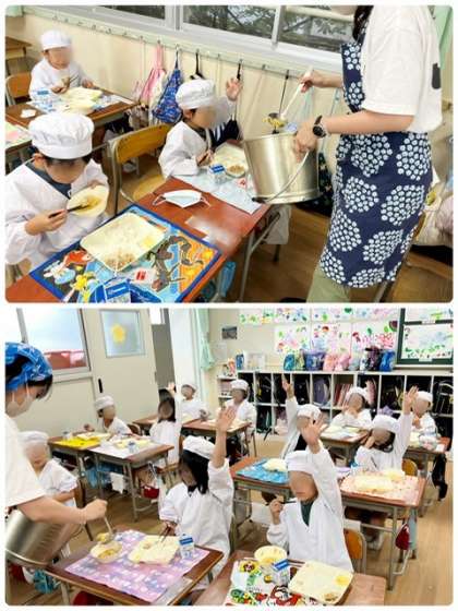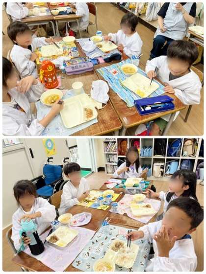 ゴーヤを初めて食べる児童もいましたが、栄養がたっぷり入ってるよ〜と言うと苦そうな顔をしながらもしっかりと食べていました^^