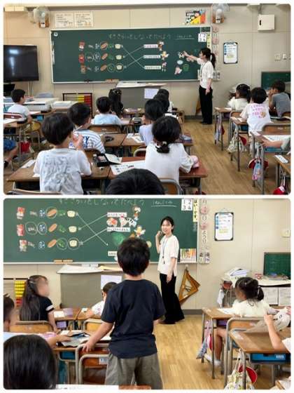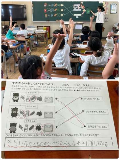 他校の栄養教諭の方2名にお越しいただいて、1年生の食育授業を実施しました。「すききらいしないでたべよう」をテーマに、それぞれの食べ物には体にどんなはたらきがあるのかを教えてもらい、苦手な食べものをどのように食べたらよいかをみんなで考えました。