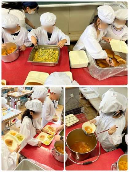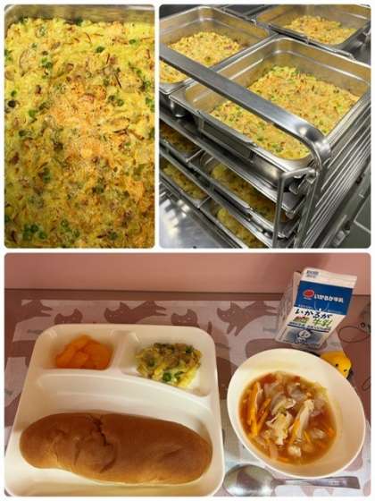 ベーコンやたまねぎ、マッシュルームをいため、いたまればカレー粉やクリーム・牛乳、小麦粉を加えて煮こみます。その後マカロニとグリンピースを加え、パン粉と粉末チーズをふり焼き物機で焼いています。