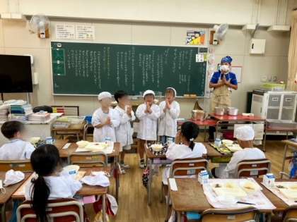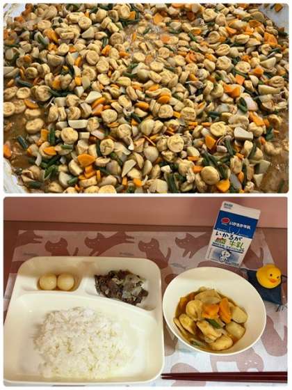 今日の給食には、行事献立として「一口がんもとさといものみそ煮」「みたらしだんご」が登場しました。