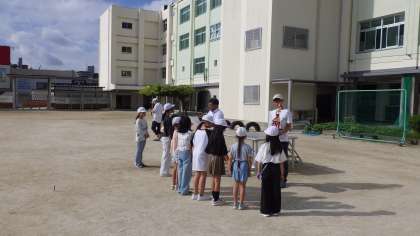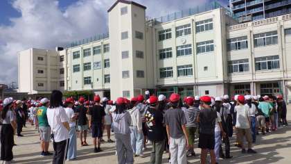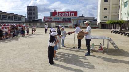 9月17日(火)久しぶりの運動場での全校朝会です。よさこいで活動しているみなさんんが大きな大会で優秀な賞をいただき表彰状とトロフィーを渡しました。がんばりました。