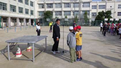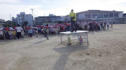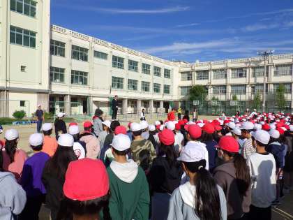 11月5日(火)爽やかな秋空の下、全校朝会を行いました。バスケット「第一回マナヒガカップU10」で優勝したカップを渡しました。