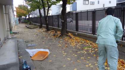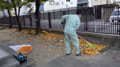 12月4日(水)冬本番を迎え、桜の葉がたくさん落ちてきています。管理作業員さんが落ち葉を掃除してくれています。
