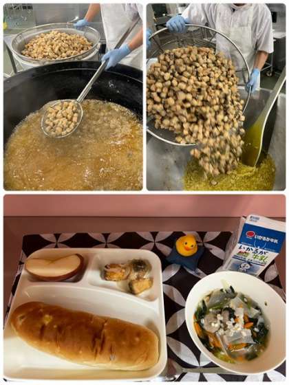 「さけのマリネ」は塩こしょうで下味をつけた鮭にでんぷんをつけて揚げ、たまねぎの入ったマリネ液をからませて作ります。