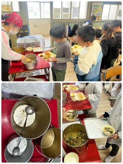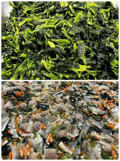「肉だんごと押麦のスープ」は肉だんごを主材に、旬のだいこんとにんじん、青みに冷凍のほうれんそうを使用し、食物繊維の多い押し麦を加えて作ったスープです。