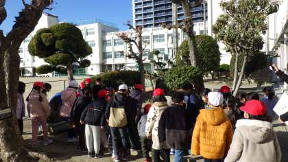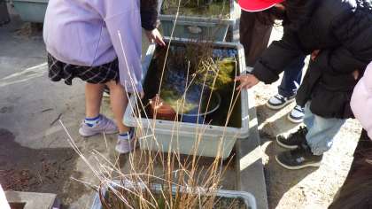 1月10日(金)朝から寒い日でした。学習園では氷が張っていました。1年生が氷の観察をしています。