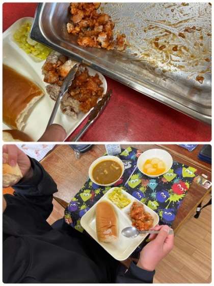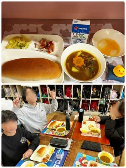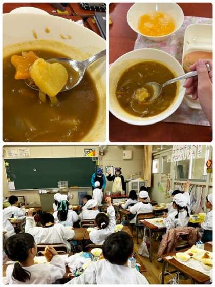 調理員さんも卒業をお祝いしたい!と「カレースープ」にラッキーにんじんだけでなくラッキーじゃがいもをたくさん入れてくださっていて、6年生も大喜びでした。