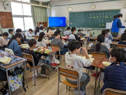 他の学年も給食初日。担任の先生とやり方を確認しながら準備と片付けをしていました。
