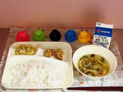 きょうの「鶏肉のたつたあげ」は中はジューシー、外はカリカリで生姜の風味が程よく、どのクラスでも大人気でした。五目汁とキャベツの梅風味も、全クラス完食でした😊
