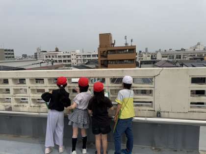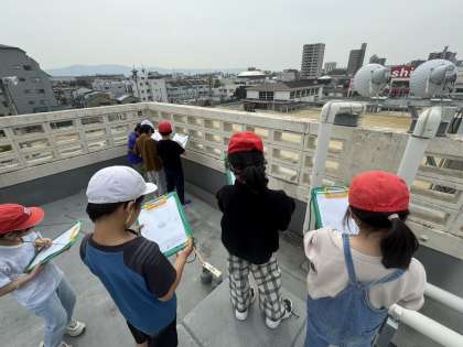 3年生になって初めて学習する社会。今日は、学校の屋上から自分たちの住む町を調べました。