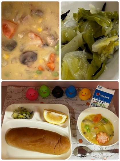 今日の「鶏肉とコーンのシチュー」は乳を使用せず、鶏肉とベーコンを主材にじゃがいも・たまねぎ・コーン・にんじん・マッシュルーム、彩りにむきえだまめを使用した、自然な甘みが児童に好評な献立でした。