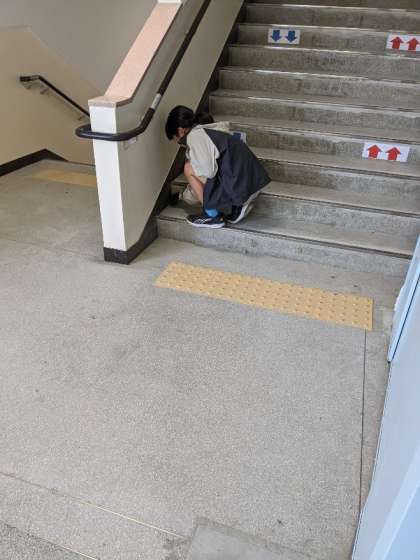 乾いたぞうきんで黒板を拭いたり、小さいほうきで階段の隅まで掃いたりして、学校をきれいにしています。