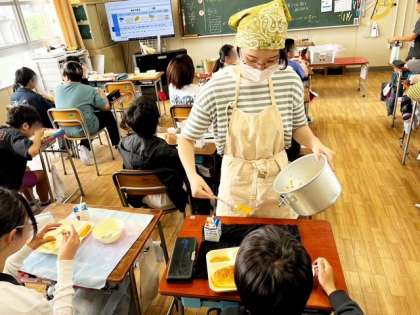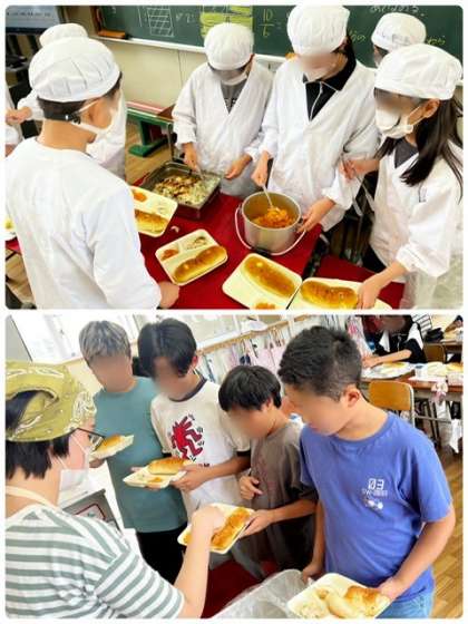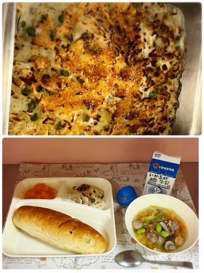 今日の「マカロニグラタン」は、鶏肉とたまねぎをいためたものに、クリーム・小麦粉・牛乳・グリンピース・マカロニを加え、粉チーズとパン粉を上からふって焼いています。