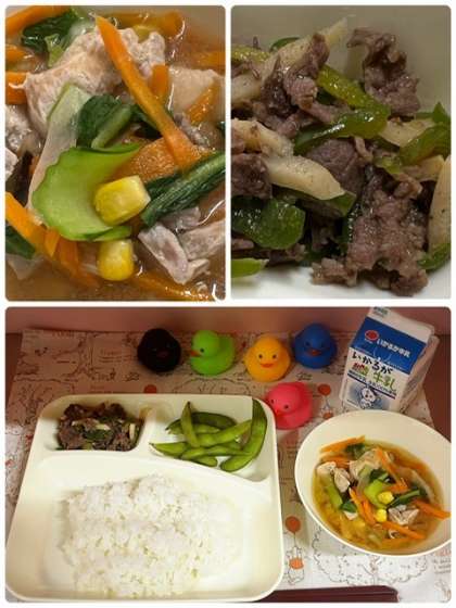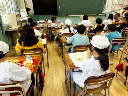 中国料理で、「チンジャオ」はピーマン、「ニューロウ」は牛肉、「スー」は細切りという意味です。今日の給食では牛肉・細切りにしたピーマンとたけのこを使い、砂糖・こいくちしょうゆ・オイスターソースで味付けしています。