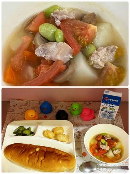 鶏肉・じゃがいも・たまねぎ・むきえだまめ・マッシュルームなども入って、具だくさんで栄養満点の献立でした。