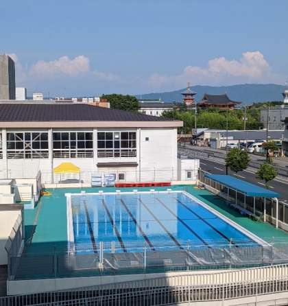 PTAのご協力もあり、北門からの目隠しになるシートを付けたり、プールサイドにテントを置いたりすることができました。