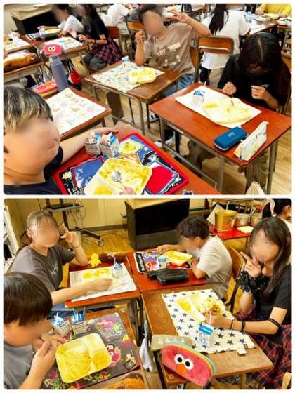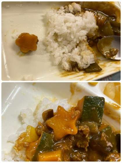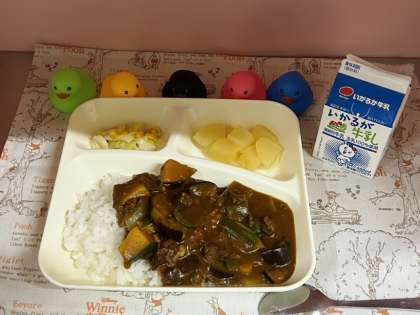 今日は、かぼちゃ・ピーマン・なす・トマト(缶)をたっぷり使ったカレーライスでした。いつもは調理員さんがラッキーにんじんが作ってくださるのですが、今日はにんじんを使いません。いざ給食時間になり、カレーの中にあれ…何か入ってる!!