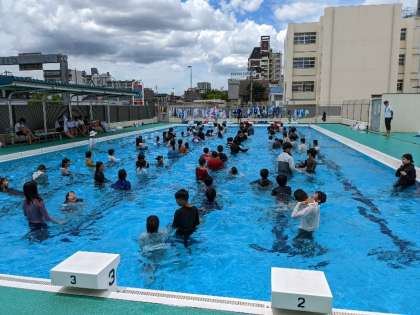 命を守るためにどうすればよいか、実際に服を着たままプールに入り、浮き方を学習しました。