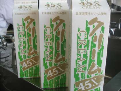 大阪市の小学校給食では、小麦粉とサラダ油をいためて作ったホワイトルウでクリームシチューのとろみをつけています(2枚目の写真)。また、今日のシチューでは、牛乳16L、生クリーム3kg(3枚目の写真)を使っているため、とてもおいしくできあがりました。1年生からは「こくがあっておいしかった」という感想も聞かれました。
