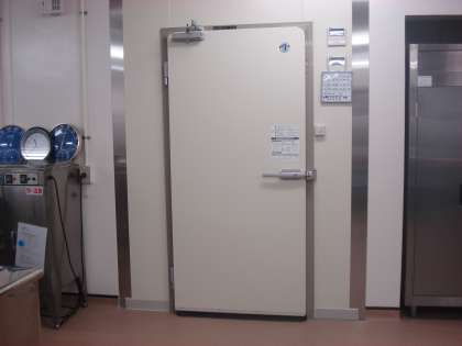 古い給食室にはなかったけれど、新しい給食室にはあるもの・・・それは「低温倉庫」といわれるものです。外からは部屋の入口のように見えますが、重い扉を開けると中は2〜3帖ほどの広さの冷蔵庫になっています。