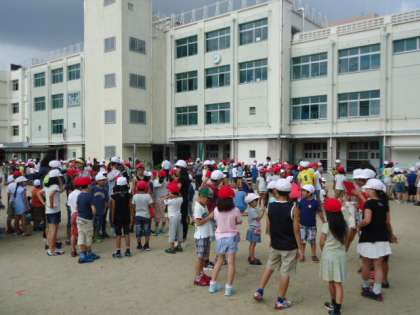 1学期は校舎工事のためフェンスが設けられて運動場が狭くなっていましたが、7月に入って工事用フェンスが一部を残して撤去され、運動場から講堂やプールが見えるようになりました。夏休み中にすべての工事が終わり、2学期からは遊具もできて運動場がさらに広くなります。子どもたちも2学期から広い運動場で活動できるのを楽しみにしているようです。