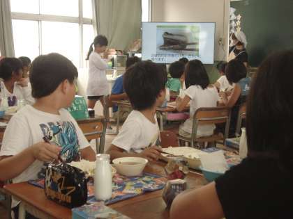 教室では“骨とり名人になろう”と題した、「さんまの骨を上手にとるコツ」を示したスライドを見ながら、骨とりにチャレンジしました。悪戦苦闘の末、「(中骨が)きれいに取れたよ!」と自慢げに、うれしそうに報告してくれる『骨とり名人』が続出しました。