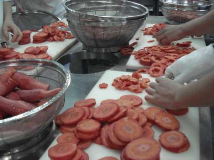 今年初めての給食は、正月の行事献立「ちらしずし、ぞう煮、ごまめ、牛乳」でした。関西風の白みそ仕立てのぞう煮には、毎年、金時にんじんを使用していますが、今回は旭区ほか4区で大阪市内(東住吉区)産のものが使われました。「大阪市なにわの伝統野菜」のひとつである金時にんじんは、一時生産が途絶えたものの、現在は市内の一部の地域で栽培が復活されつつあります。